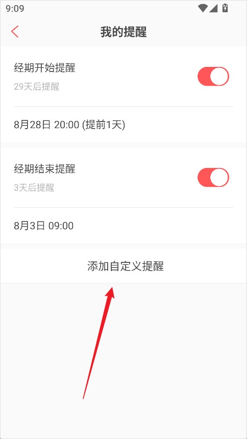 【贴心提醒】您可以根据自己的需求设置经期开始前和经期结束时的提醒及其他自定义提醒