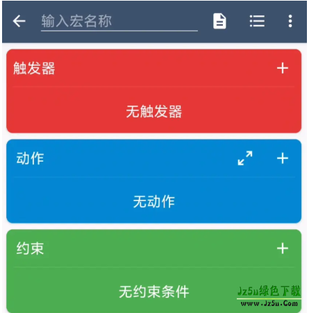 建立一个基础的功能,需要填写3个步骤,MacroDroid的触发器、动作和例外条件。