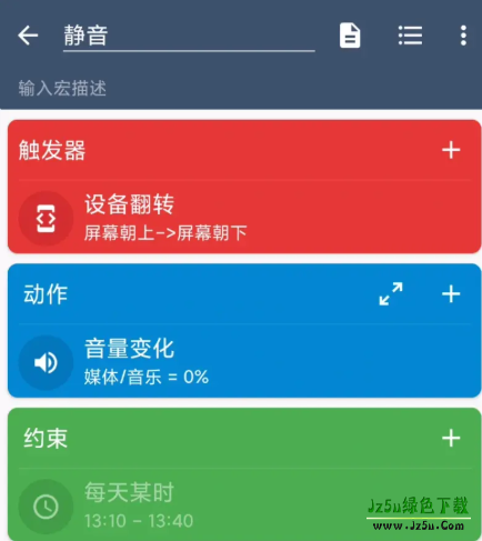设定好限制时间,就能在指定时间,翻转一下手机自动静音了。在早上去公司的路上,也可以设定成在指定时间,连接上耳机的时候,自动打开某个软件并播放音乐。又或者是摇一摇切歌等,只要加好限制条件就能较少很多误操作。