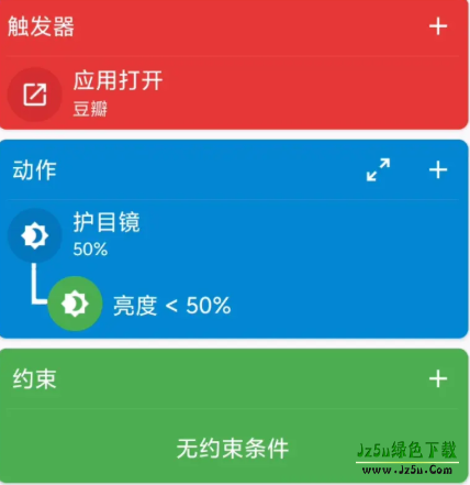 每个动作也可以单独加上限制条件,自动化软件最怕的就是在不想运行的时候自己操作,MacroDroid在这方面做得还是挺好的,响应速度也很快,像是到了夜晚打开软件自动开启护眼,这个就挺适合老司机熬夜啥的。