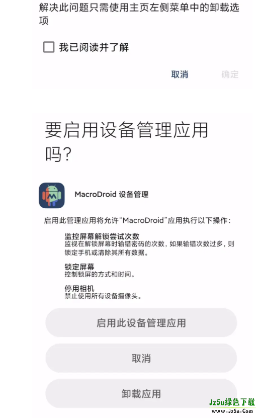 如果你已经为MacroDroid启用了设备管理权限,那么你需要在卸载之前禁用它。某些版本的Android在卸载时不会提醒你这个问题,所以你不知道为什么不能卸载。为方便起见,我附上了一个