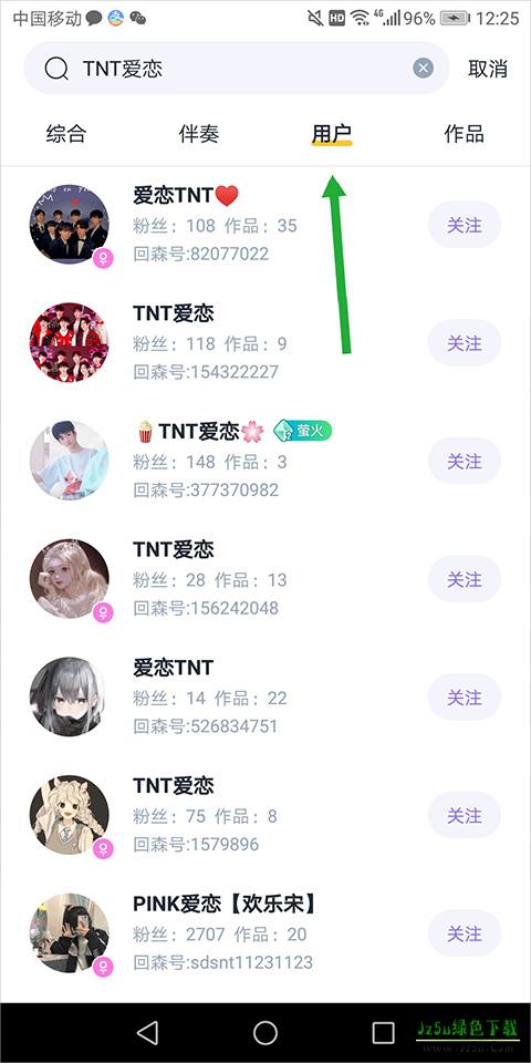 在打开的搜索结果页面中,将页面切换至【用户】处(下图绿色箭头所指),选择森友进行关注即可