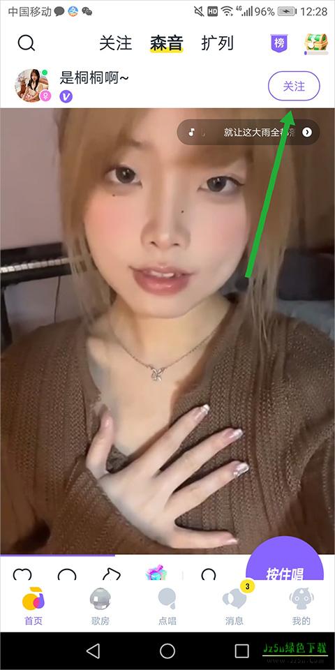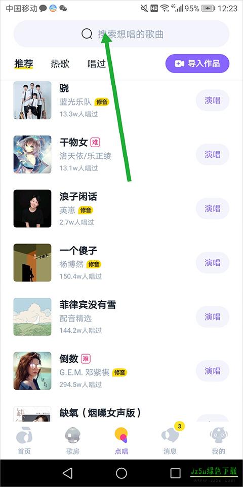 2、进入 【点唱】页面中,通过页面顶部的搜索框(下图绿色箭头所指)输入森友的id或者昵称可以查找到好友