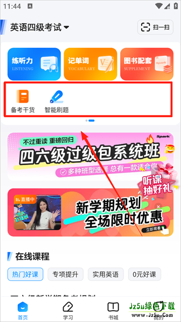 1、打开星火英语最新版App,在应用首页清晰位置找到并点击“智能刷题”功能入口,开启高效练习。
