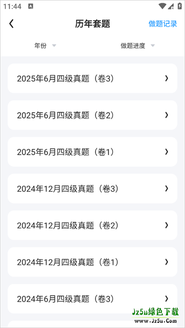 3、若选择“历年真题”,即可按年份或考试类别查看到完整的往届考试真题套卷,直接点击目标套题即可开始练习。