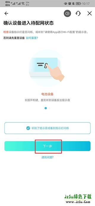 3、根据页面提示,将摄像头接通电源并开机。在听到设备启动提示音后,点击APP上的“下一步”继续。