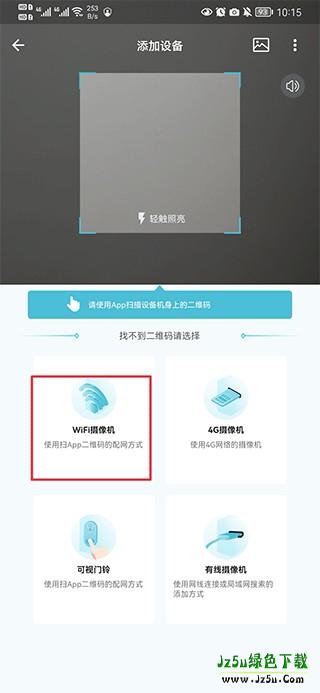 2、优先使用手机扫描智能摄像头机身上的二维码进行快速绑定。若无法扫码,可选择“WiFi摄像机”等其他连接方式。