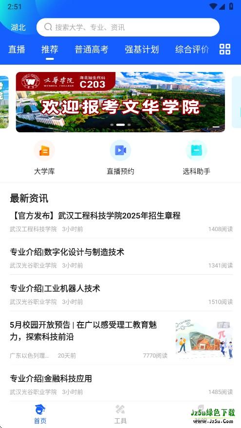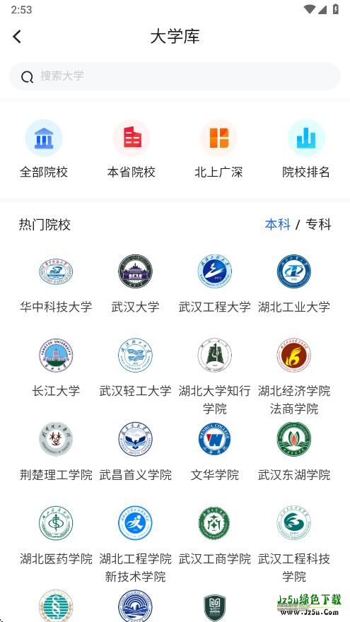 2、深入探索大学库:通过“大学库”功能,可按本省院校或省外(如北上广深)筛选学校,查看如“九江学院”等具体院校的详细介绍与招办联系方式。