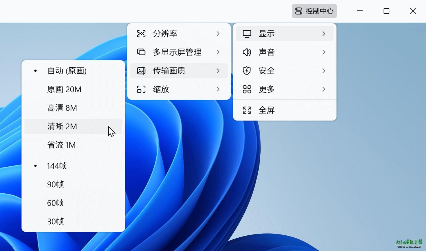 2、连接成功后,点击右上角的【控制中心】,即可展开功能菜单,自由配置远程连接选项,如【声音】、【安全】、【分辨率】、【多显示器管理】、【传输画质】等。