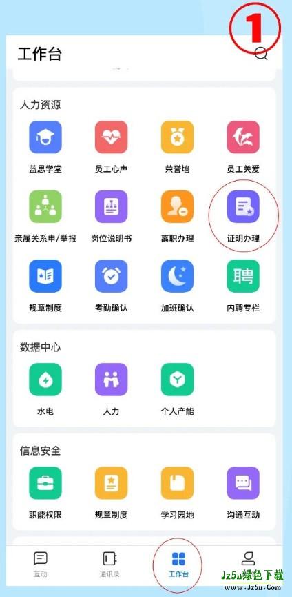1、打开飞鸽互联蓝思,点击工作台,然后选择证明办理