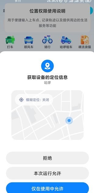 2、在提示获取定位信息时,选择【仅在使用中允许】