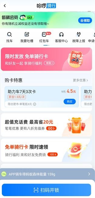 3、积极参与低碳出行任务,践行环保理念,完成后有机会收获平台赠送的优惠券、骑行卡或各类惊喜实物礼品。