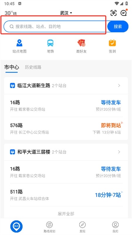 2、打开软件进入首页后,在上方搜索框输入线路、站点或者目的地