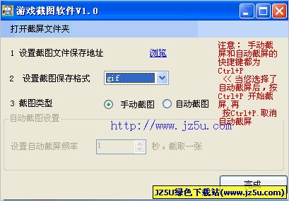 首先欢迎使用这个屏幕截图软件,主要用于游戏截图(全屏)。本软件支持安装了。net frameword 2.0或以上版本的系统(win 7 /vista 自带 .net framework 2.0 不用再安装)。本软件的默认快捷键是 ctrl+p设置完成后,按ctrl+p开始截取(在自动截取模式下,再次按ctrl+p结束自动截取)谢谢您的使用。