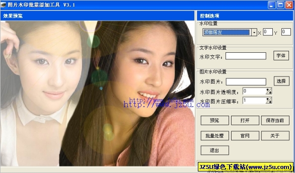 这是一个可以对选中的图片文件添加水印的小程序,操作非常简单,但功能还是比较强大的,批量处理图片的速度也非常快,主要特色为:可以使用本地计算机中安装的字体设置文字水印字体,具备强大的字体特效处理功能,具体性能需要用了才能体会。