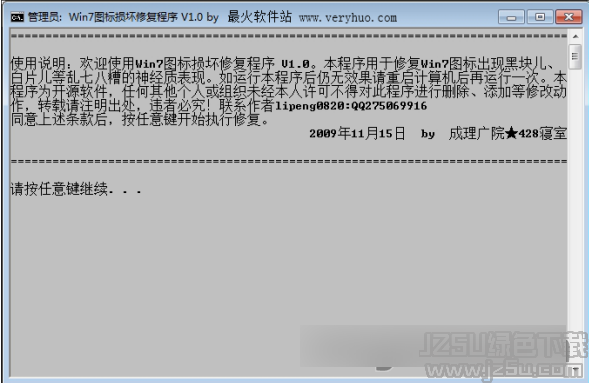 欢迎使用win7系统图标损坏修复程序。本程序用于修复Win7图标出现黑块儿、白片儿等乱七八糟的神经质表现。如运行本程序后仍无效果请重启计算机后再运行一次。本程序为开源软件,任何其他个人或组织未经本人许可不得对此程序进行删除、添加等修改动作。