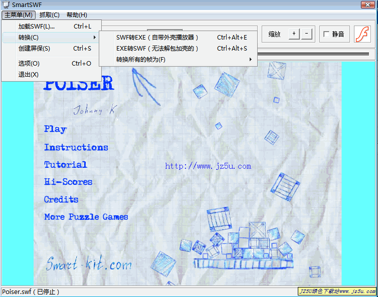 它不单单只是看,最主要的是 SmartSWF 可以将您所的Flash(*.SWF)转换成 EXE 文件格式,转换速度快,而且生成的EXE文件只比原来的SWF文件大一点点。并且 SmartSWF也可以将您的Flash(*.SWF)中的每帖转换成图片格式(BMP), 您可以提取您想要的图片.......