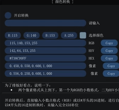 十六进制像素转换工具是一款制图辅助软件。它是可以直接以进制的方式转换颜色的小工具,在进行制图等工程时每一个像素的颜色都是十分重要的,颜色转换器绿色版可以是你在制图是能够准确地运用像素颜色,让你可以随意的转换您需要的颜色进制。