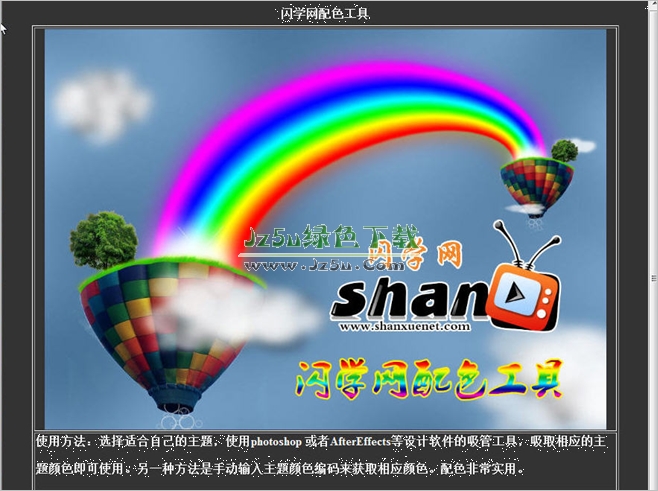 闪学网颜色配色工具内部包含有关颜色主题设计的教程,同时包含常用设计类主题颜色,通过photoshop或者after effects吸管工具吸取主题颜色,快速配色!同时也可以参考主题颜色数值,然后直接在ps等设计软件输入数值。