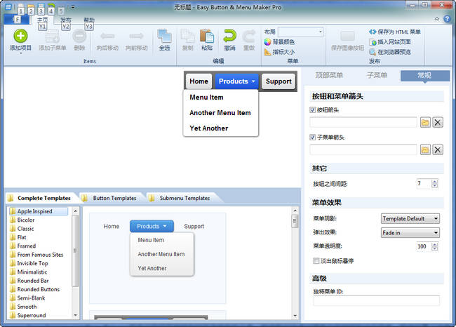 Easy Button and Menu Maker一款专业的网页按钮和网页菜单制作工具,程序帮你快速创建复杂的按钮和动态菜单,程序内置了非常多而且非常精美的模板可以供选择,支持中文输入,所见即所得的操作方式,非常方便。