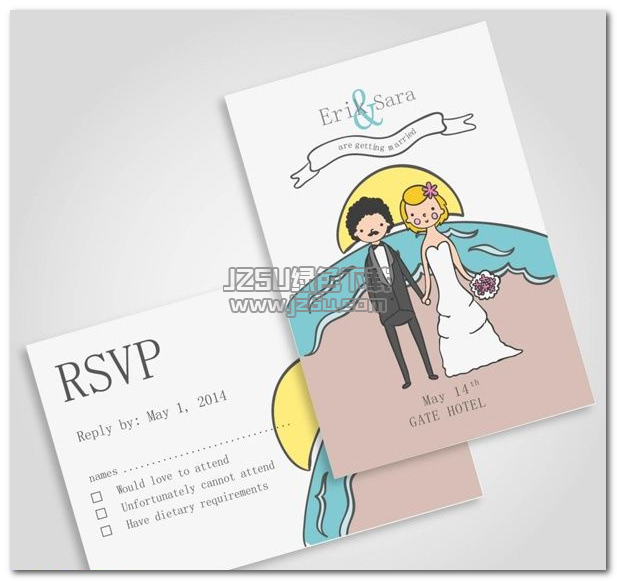 婚礼明信片邀请卡卡通新人背景矢量素材用简约的卡通风格来展示卡片邀请内容。日期地点内容用艺术字展示,详细还请见JPG缩略图,喜欢可以点击收藏!