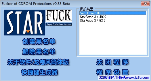 StarFuck(屏蔽光驱软件)免除了打开机箱,拔插光驱了。Starfuck是一个屏蔽物理光驱软件,原理就是将物理光驱屏蔽掉,从而可以不用拔物理光驱就可以用虚拟光驱运行这些游戏的软件。