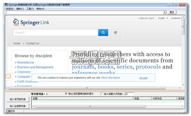 亿愿Springer文献资料检索下载管理是一款专业下载国外科技数据库期刊书籍文献资料的辅助工具!软件检索到自己需要的英文文献资料,然后批量下载到本地,资料种类均为PDF全文,保存下来的文件名均为文章名称,方便离线浏览PDF文件,是高级科研人员的必备工具!不需要登录网站,即可流畅下载!