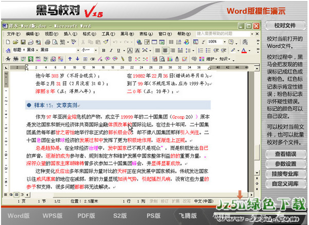 黑马校对V15是北京黑马公司全力开发的新一代校对系统,荣获中国优秀软件终身称号并且通过了中国版协校委会的实测鉴定。内含S2版、PS版、Word版、WPS版、小样版、飞腾插件版和PDF插件版七个全新的校对界面,采用超大规模词库和重点词监控等先进的校对计算技术,在校对质量、校对功能和易用性等方面都有了飞跃性的提高,达到了当前电脑校对软件发展的最高水平,智能技术居于国际领先水平。