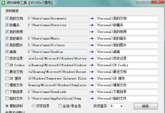 资料转移工具是一款简单好用的电脑文件转移工具。软件功能非常强大,界面简洁明晰、操作方便快捷。这款软件可以文档、收藏夹、我的视频、我的音乐、桌面等资料进行转移,提供复制资料、仅变目录、全选/非全选、改变盘符等,方便用户移动磁盘文件,适用于重装系统或者系统还原的朋友。