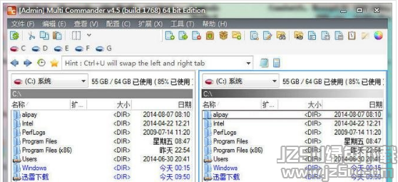 3、标签页和双面板的双重管理方式,双面板虽然提高效率,不过占用空间较大,这个也就是为什么软件No1非常喜欢带有标签页的资源管理器的原因。而Multi Commander则集合了这两者,肯定能够带来新的使用方法和更好的使用效果。