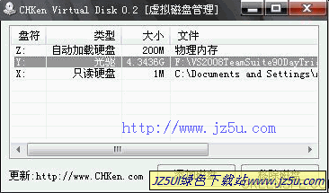 CHKen Virtual Disk (虚拟磁盘) 是一个非常小并且实用的虚拟磁盘/内存盘/光驱绿色工具! 随身携带必备软件之一!驱动内核映像只占4K(32位)/8K(64位)内存! 当退出程序,并且没有虚拟设备时,驱动会自动卸载!
