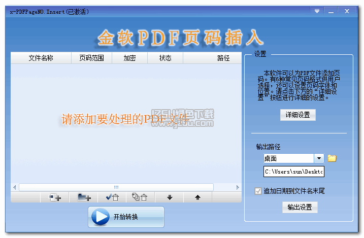 金软PDF批量页码插入工具是一款专门为PDF文件批量添加页码的工具,x-PDFPageNO.nsert的出现,使得在PDF文档中添加页码变得更加轻松。利用这款软件,可以批处理同时为多个文件添加N个不同页码项目,功能强大。数字格式页码有两种,一种是带间字符,一种是不带间字符;字母格式页码有两种,一种是小写字母格式,一种是大写字母格式;还有甲、乙、丙格式和子、丑、寅格式;另外还可以对输出文件进行线性化输出,提高文档的浏览速度;添加用户密码和所有者密码,保护PDF文档的版权。x-PDFPageNO.nsert工具还具有快速、稳定、安全的特点,其操作方便,简单;界面清爽,灵动。它是AdobeReader/Acrobat的一个辅助软件(支持AdobeReader/Acrobat6.0以上环境),其操作方便简单。