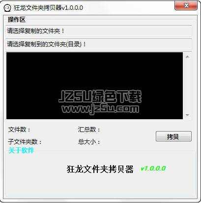 狂龙文件夹拷贝器这是一款简单实用的文件快速复制工具,具有体积小巧、操作简单的特点,它是将一个目录内的文件复制到另一个文件夹,包括子目录下的所有文件,需要的朋友快来下载使用吧。