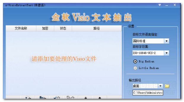 金软Visio文本抽出是一款可将Visio文件批量抽出文本到文本文件中的工具。这款金软Visio文本抽出工具具有快速、稳定、安全的特点,可以同时为多个Visio文件进行抽出文本。软件支持17种常见可转换字符集,操作方便,界面清爽。欢迎有兴趣的朋友前来jz5u下载金软Visio文本抽出使用!