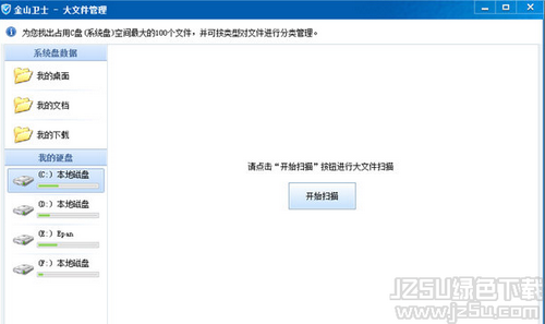 金山卫士大文件管理是金山卫士里面的一个独立小工具。一些用户经常遇到磁盘空间不足的情况,但是在清理测磁盘之后发现还是会提示,那么说明您的电脑硬盘目前正被一些大文件所占据,这时我们就应该手动检测电脑中的大型文件究竟是否有用,如果有的用户硬盘空间较大,文件较多这样查找起来很不方便,所以在这里金山卫士大文件管理功能可以发挥它的作用。欢迎大家来jz5u下载体验!