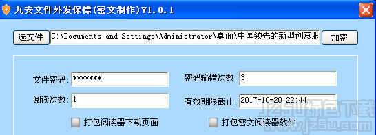 用鼠标双击桌面快捷图标,或用鼠标右键点击一个文件,执行弹出菜单[九安外发保镖(密文制作)],打开软件主界面,设置阅读次数、有效期限、文件密码、密码输错次数。