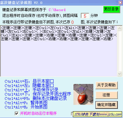 嘉茨键盘记录截图属于嘉茨软件系列,是一款国产经典软件。程序全自动定时保存(也可选择手动保存),抓图间隔时间可自定义(1-99分钟)。本程序运行时即开始记录键盘输入(包括鼠标)但不抓图,可选择是否开机时自动运行本程序,是否程序运行即开始抓图,等等。