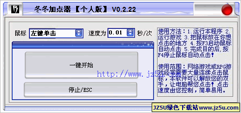 一个很有用的小软件,如果你在平时的游戏或是工作中经常需要大量点击鼠标左键或右键,如果你喜欢玩网络游戏,RPG游戏,那么一定有大量点击鼠标的经验,非常浪费时间,浪费精力,消耗鼠标!这个小软件可以解放你的手指啦!只要按下热键,让鼠标自动点击器帮你点击吧!建议您使用已经默认好的设置,如果设置更快的速度,在使用时可能会引起游戏掉线.(游戏中设置右键买东西,设置左键自动加属性点)