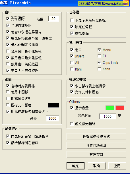 这是一款日本人设计的绿色软体,最近改版之余也推出了英文的版本。Pitaschio 直接执行后,会常驻于系统工作列,它可以改善 Windows 原本视窗的一些功能,增强滑鼠与视窗、桌面的互动,并且让你可以自订许多快捷操作。一开始使用时,需要一些设定来让它符合你想要的操作方式,首先到常驻工作列的 Pitaschio 图示上按滑鼠右键叫出功能表,选择Setting,这里可以设定一些基本的视窗桌面优化,然后再选择其中的Setting of Mouse Shortcut进入滑鼠快捷方式的设定,完成这两个步骤后,你就可以开始体验 Pitaschio 带来的许多实用功能了