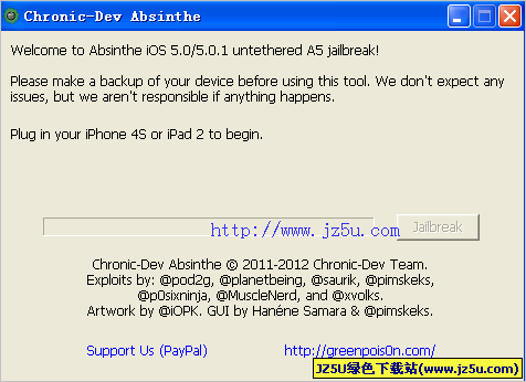 absinthe-win-0.2可以完美越狱iPhone4S(5.0 (9A334), 5.0.1 (9A405),5.0.1 (9A406))5.0以上固件版本,可以支持iPad2 5.0.1 (9A405)固件完美越狱。