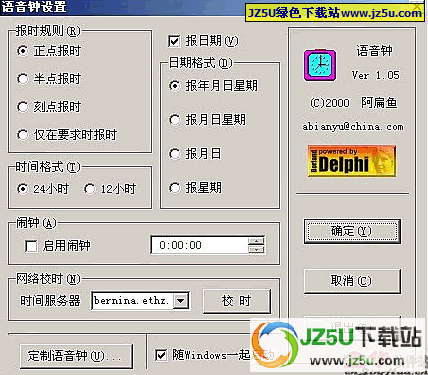 是一款用中文语音为您报时的软件,同时还具有利用英特网时间服务器校准本地时间的功能。该软件短小精干,功能简明扼要,软件本身只有一个可执行文件,大小为570k(包括声音)。安装删除均很简单是一款绿色软件。软件的运行自动在后台进行,以图标形式显示在桌面系统托盘上。到达设定时间时就有男童声为您报告时间,或者,您用鼠标左键点击图标也有男童声为您报告当前时间,用鼠标右键点击图标则弹出菜单,您可以进入设置界面,进行有关项目的设置,如设定报时规则、网络校时、订阅更新消息等等。