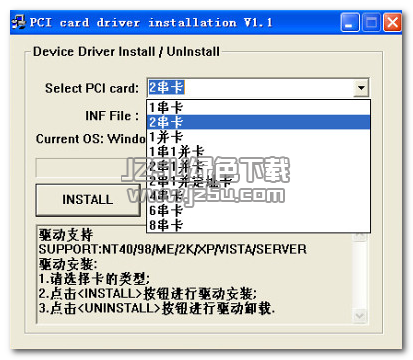 用户要先软件,而后解压安装,开启软件之后运行主程序,而后根据自己的要求来选择串卡的类型,选择好了之后点击确定,点击install来进行驱动的安装,点击uninstall就是卸载这个驱动程序。