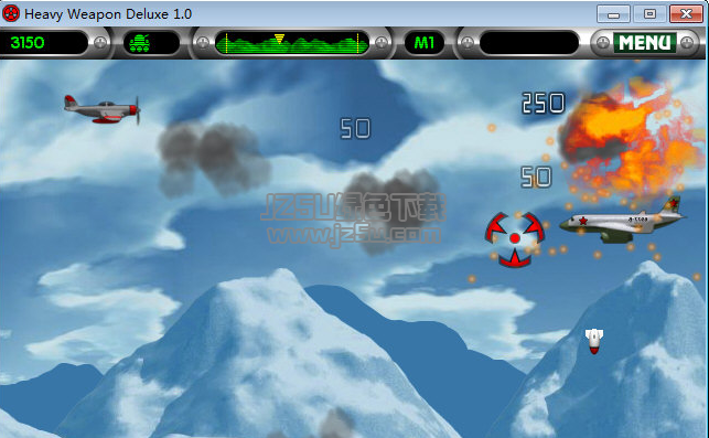 重装兵器是《植物大战僵尸》游戏公司POPCAP的早期游戏作品,游戏虽然很小,但是制作很是精良,无论是音效和打击感以及可玩性都非常的出色。重装兵器中文版游戏中玩家需要控制一台高射炮,然后不断的打击天空中的敌军战机,游戏提供了任务模式和生存模式两种游戏模式,任务模式中共有19项任务,每完成一项任务便可得一个点数,可以用来给坦克装备或升级导弹、激光等六种特殊武器。第二个模式就是生存模式,看你存活多久。欢迎大家来jz5u体验!