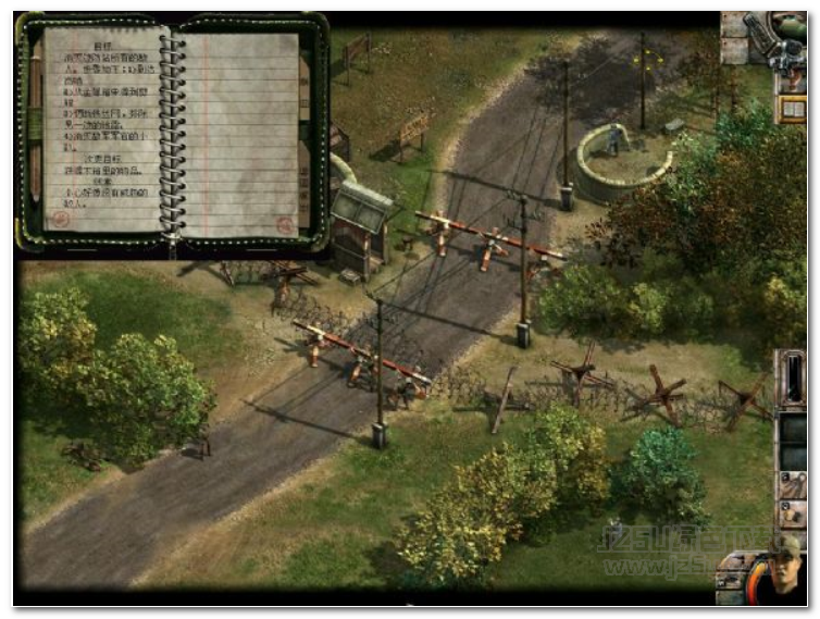 6、任务笔记本:点击打开控制界面上的图标就可以看到本关的任务提示,再点击其中的一个任务会有图解说明,然后会有一靶形的图标,点击它就会有箭头提示为了完成当前任务你该去哪儿,不知道该做什么的时候应先打开笔记本看看一个任务的图片说明,然后点击靶形图标,盟军敢死队2勇往直前游戏就会出现一个黄色的箭头指引你。