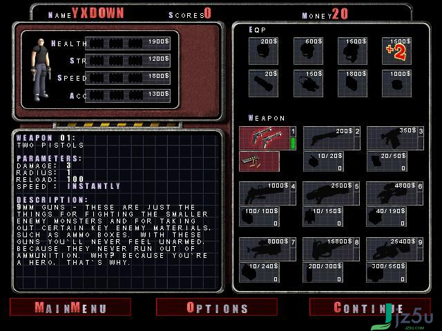 一起为了习惯部分玩家的要求,能够设置画面中血的色彩,绿色和赤色。玩家最多能够一起使用9种兵器,除初始兵器双持手枪之外均有弹药约束。弹药及兵器需要在每一关开端前的商铺界面购买,仅有三种护甲。