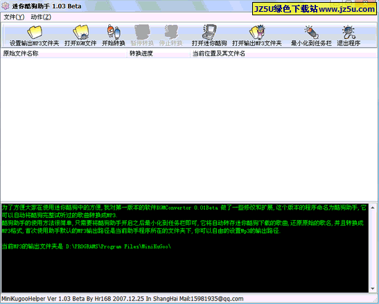为了方便大家在使用迷你酷狗中的方便,我对第一版本的软件KGMConvertor 0.01Beta 做了一些修改和扩展,这个版本的程序命名为酷狗助手,它可以帮助你在使用酷狗的同时自动下载MP3.大家知道酷狗在试听音乐的时候只有10首歌曲的缓冲,当试听10首歌曲后再试听下一首歌曲将会覆盖前一个下载的歌曲,这样就会导致试听的歌曲可能会被重复下载,在某些不知道的情况下迷你酷狗会自动清除自己程序目录下的所有试听文件,为了解决这种情况,迷你酷狗助手可以帮助你在试听的同时监视下载文件,一旦KGM格式的歌曲文件下载完毕就自动解密KGM格式的文件到Mp3格式,并且输送到你设置的输出文件夹下,还会将原先的歌曲名称还原成正式的MP3文件名,而不是一串酷狗定义的数字.程序第一次使用的时候默认的输出Mp3文件夹就是助手程序所在的路径,请先设置好输出文件夹,(程序下次会记住上次的输出文件夹位置,所以只需要设置一次即可),并且最小化酷狗助手到任务栏中便可以边听歌曲边下载了,大家不用担心助手监视所消耗的资源.因为采用的是系统通知,所以不会循环或者实时监视的且助手不工作的时候会主动释放自己所使用的内存.