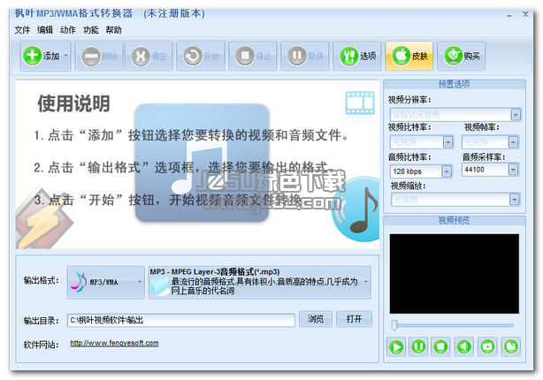 枫叶MP3/WMA格式转换器是一款使用枫叶MP3/WMA格式转换器可以方便的将各种流行的音频格式转换为MP3和WMA格式。本软件可以作为WAV转MP3音频转换器、WMA转MP3格式转换器、RM转MP3转换器、RM转WMA转换器、FLV/F4V转MP3转换器、MP3转WMA格式转换器、无损音频转MP3格式转换器。软件还支持WAV、MP3、WMA、OGG、AAC、AC3、FLAC、AMR等音频相互间任意转换,可以说软件是一款万能的音频转换工具。特别是如果您需要从视频转音频格式,本软件同样可以实现,比如您下载的RMVB、MKV、AVI、MP4、3GP、FLV、SWF、MPG、WMV、MOV等流行的视频都可以任意转换为MP3格式和WMA格式。您的DVD光盘中的VOB,SVCD、VCD光盘中的DAT、MPEG视频都可以提取出音频并转换为MP3格式和WMA格式。软件采用多线程转换,支持批量转换,支持视频和音频预览。可以任意调整MP3音频和WMA音频的清晰度、声道、采样率、音频比特率,满足您的不同转换要求。