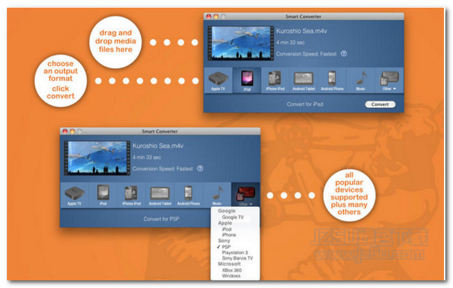 Smart Converter Pro是一款非常实用功能强大的音视频格式转换工具。支持批量转换,你可以导入任意格式的视频或者音频文件,然后导出的文件并不是指定的格式,而是设备,支持Windows、XBOX、Apple TV、ipad、iPhone、ipod、music、三星、Android、Sony等等,它会自动选择一个最合适的格式,并快速完成这项任务,如果是苹果设备的话,还可以自动导入iTunes,非常方便。喜欢的用户可以到jz5u来下载Smart Converter Pro。