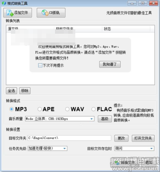 酷狗kgma转MP3转换工具是一款专业实用的转换工具。您想要将酷狗转换为MP3吗?那么就来看看这款酷狗kgma转MP3转换工具。该款工具能够协助用户将无损音频格式转换为MP3APEWA VFLA C等常见的音频格式,支持用户设置音乐质量,并且支持进行CD抓轨,支持用户设定任务优先级。软件体积小巧,功能强大,使用简单。欢迎需要的用户来下载体验!
