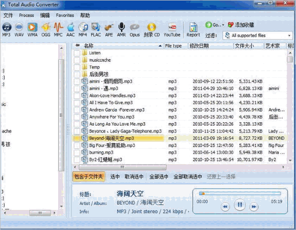 TotalAudioConverter官方中文注册版是一款官方支持中文的非常不错的音频文件格式转换工具,可简单地将任何音频文件转换成其他的大小和格式而不需要生成临时的Wav文件。可转换CD音轨,修改波特率和频率。支持各种流行的音频格式。
